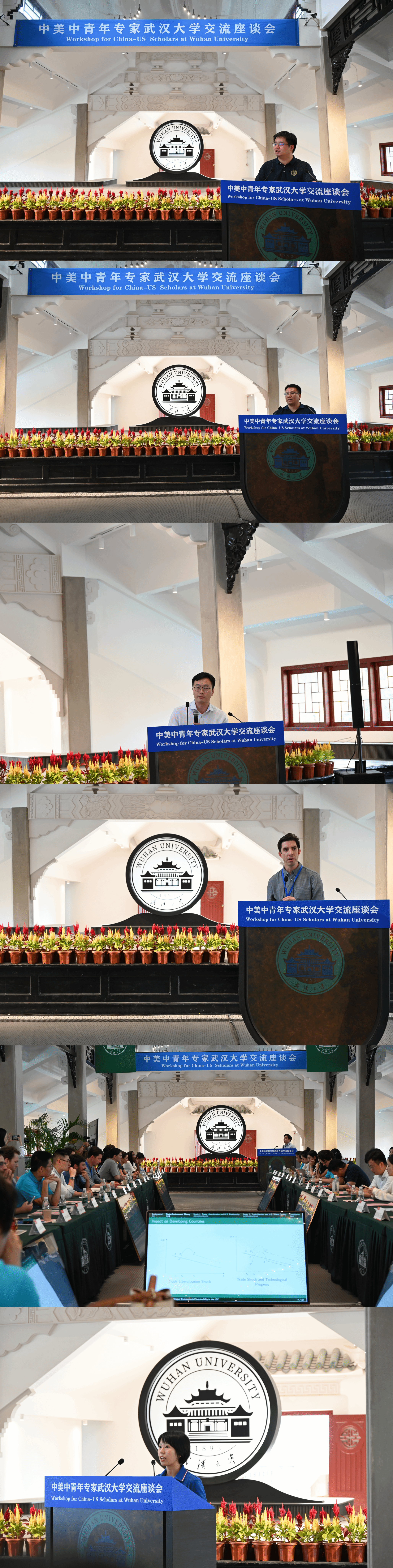 蒋盛君副教授主持了座谈交流环节,中美双方学者、学生代表分别作了主题分享。美国加拿大经济研究所所长余振教授讲述了武汉的全球化故事,分享了武汉推动实现绿色创新发展战略、深化开放之路的鲜活案例;经济研究所所长杨冕教授分享了关于超高压电力传输与跨区域碳排放关系的研究成果;美国洛约拉玛丽蒙特大学教授泰勒·哈伦(Tyler Harlan)对比了中国西部与美国西部的新能源政策,以及对区域发展的影响;美国加拿大经济研究所博士生刘今和熊翔宇分别就中国绿色金融中的股权投资和中美贸易对环境可持续发展的影响分享了各自的研究成果。弘毅学堂本科生王子竹作为学生代表发言,生动地介绍了海棠书屋