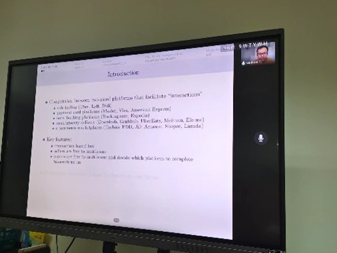 首先,Tat-How Teh老师介绍了本次报告的核心内容是提供了一个一般的框架来分析任意数量的对称双边平台之间的竞争,其中买家和卖家可以多归属,平台在对双方收取的每笔交易费用上竞争。主要讨论了平台的数量,多归属买家的比例,买卖双方的交易价值和用户的异质性程度如何共同决定平台收取的费用水平和结构。