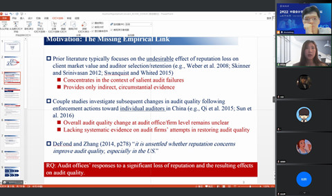接着,刘雪娇教授分别从理论框架、研究问题、研究动机、文献回顾、假设发展、实证结果和研究结论等角度展开了对论文的分享。以往研究表明,会计师事务所遭受声誉损失时,常常通过增强内控体系、增强审计质量监管、使用AI系统更新换代等方法进行弥补。文章基于声誉动机视角,针对审计行业是人力资本密集行业的特性,分析了其中一种补救措施即人力资本投入对审计质量的影响,先进行了严谨的理论分析,然后利用北美BGT网站招聘数据进行了实证检验,并使用LinkedIn网站中数据进行了稳健性检验。