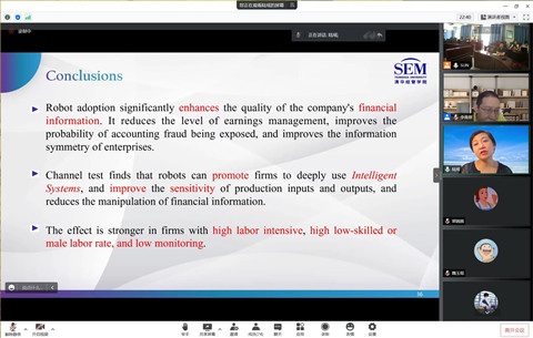 随后,陆瑶教授进行了论文的分享,从理论框架、研究问题、文献回顾、假设发展、实证结果和研究结论等部分展开。重点阐述了文章的研究动机,并从企业信息生产稳定性、准确性和外部监管强度视角对机器人的使用和会计信息质量之间的关系进行了理论分析。最后利用美国公司数据进行了实证检验。
