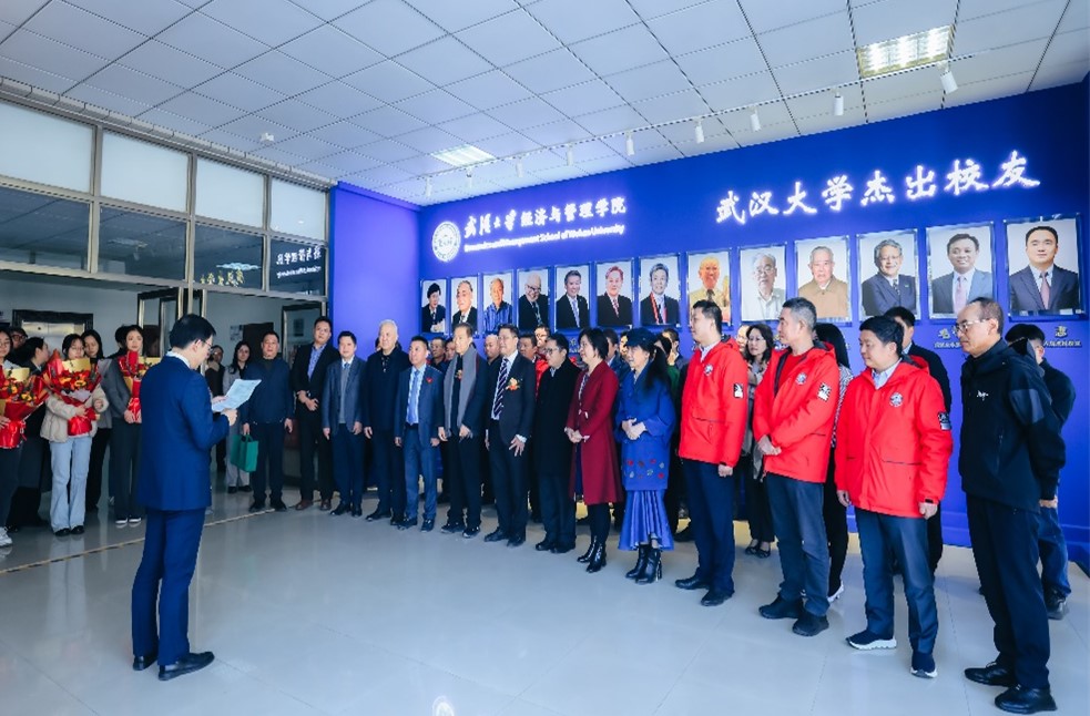 揭牌仪式结束后,陈作涛、华生、汤敏和经管院的师生在校友墙前合影留念。