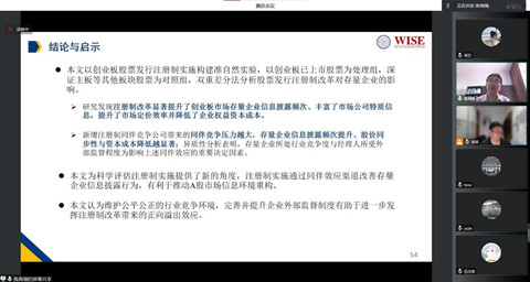 最后,陈海强教授展示了主要研究发现。注册制改革显著提升了非注册制下上市的存量企业信息披露频次,丰富了市场公司特质信息,提升了定价效率并显著降低了上市公司权益资本成本。同时,同伴压力越大,非注册制上市的存量企业信息披露频次提升,股价同步性与资本成本降低越显著。异质性分析考虑了行业竞争程度、外部监督强度等。研究结果证实,企业所处行业竞争越高与经理人所受外部监督程度为影响上述同伴效应的重要决定因素。