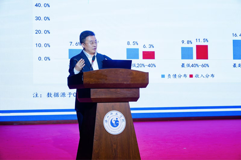 邓国营以“中国房地产市场发展与金融风险”为题,从房地产改革政策切入,摆事实、列数据,分析房地产市场存在炒房成风、脱实向虚,导致贫富分化等问题,据此他提出房地产业新发展模式需要结合市场导向与政府调控。