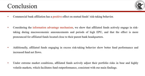 最后,张学勇教授展示了主要研究发现。与以往的研究不同,基金经理可能会为了利用信息优势而进行冒险行为。商业银行从属基金具有更大的信息优势,因此这种从属关系可以正向影响绩效与基金风险承担活动之间的关系,从而导致更高的流动性和风险承担行为敏感性,这种现象在宏观经济和经济政策高度不确定时期更为明显。