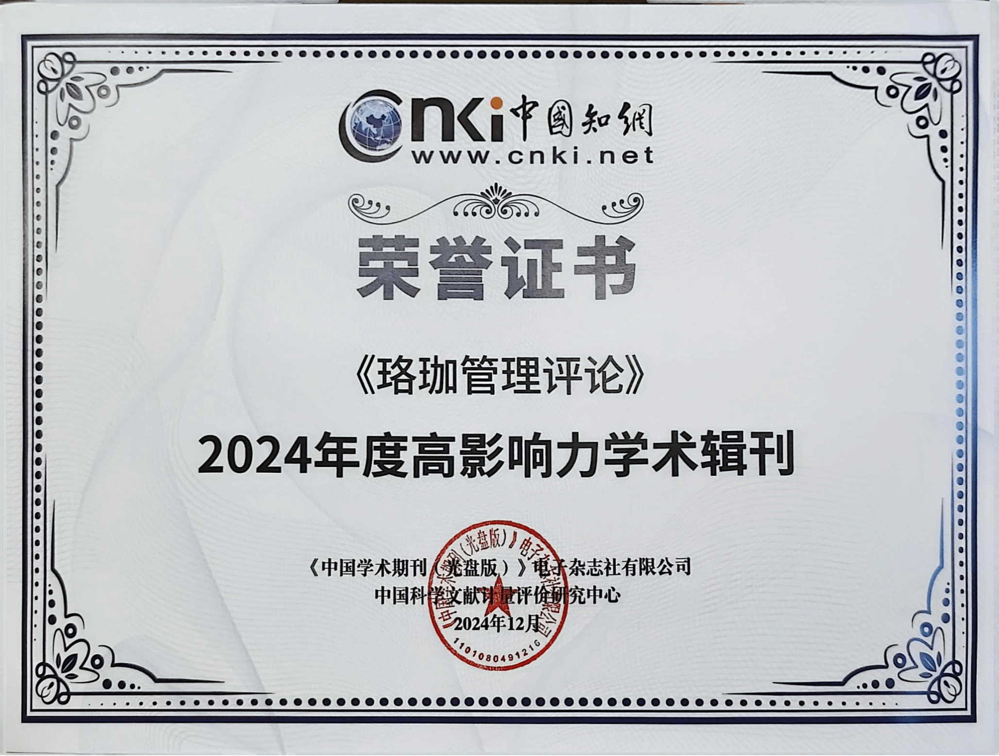 2024年12月24日,“2024年度中国知网学术影响力评价系列报告发布会”于北京召开,会议发布了《高影响力学术辑刊评价报告》(2024),《珞珈管理评论》获评“2024年度高影响力学术辑刊”,辑刊影响力指数为37.26,位居166种入选学术辑刊影响力指数第1名。
