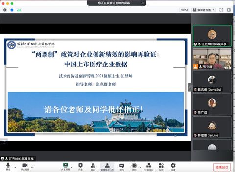 江昱坤同学首先以《“两票制”政策对企业创新绩效的影响:基于中国上市医疗企业数据》为题进行主题报告林煜恩老师肯定了这篇文章的贡献,同时建议对文章创新点做出调整以及尝试新的研究方法。