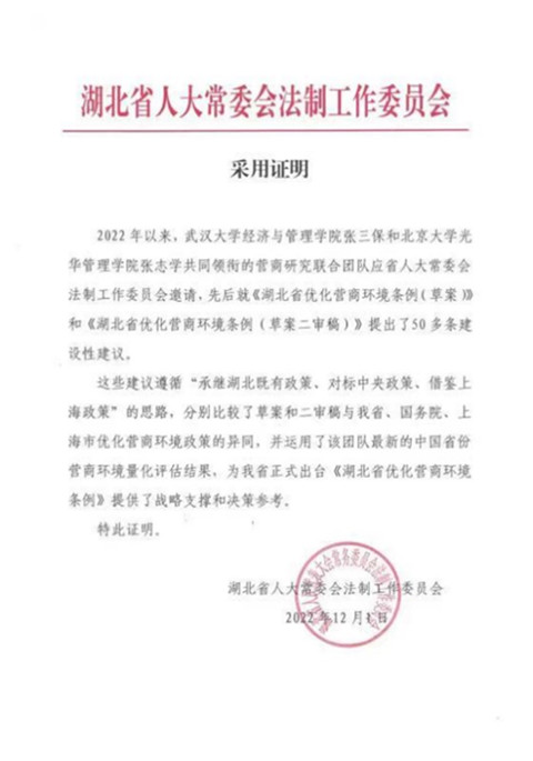 —北京大学营商研究联合团队”,先后就《湖北省优化营商环境条例(草案)》和《湖北省优化营商环境条例(草案二审稿)》提出了50多条建设性建议。近日,《湖北省优化营商环境条例》已由湖北省第十三届人大常委会第三十四次会议通过并公布。