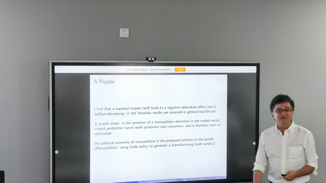 3月25日,珞珈经管创新论坛第126期在学院举行,英国诺丁汉大学Paolo Epifani教授应邀来院作题为“A Political Economy of Mercantilism” (重商主义的政治经济学分析)的学术报告。学院傅十和、吴明琴等老师及多位国内国际学生参加。