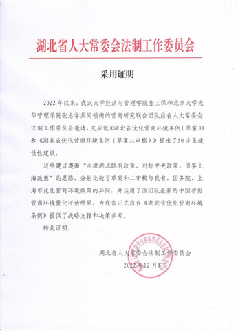 —北京大学营商研究联合团队”,先后就该条例草案和草案二审稿提出了50多条建设性建议,为《湖北省优化营商环境条例》的正式出台提供了战略支撑和决策参考。