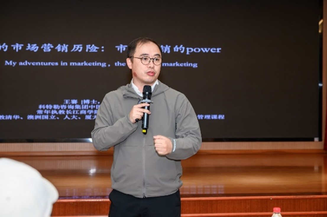随后,科特勒咨询集团中国与新加坡区域执行董事、管理合伙人王赛博士为师生带来了题为“市场营销的‘power’:我的市场营销历险20年”的精彩分享。在二十年的职业生涯中,王赛博士不断探索市场营销的边界,通过平安银行、龙腾出行、隐秀高尔夫三个亲身经历的案例故事,让在场的师生们深刻体会到了市场营销的“power”。在演讲的最后,王赛博士发自内心地感慨到海棠书屋