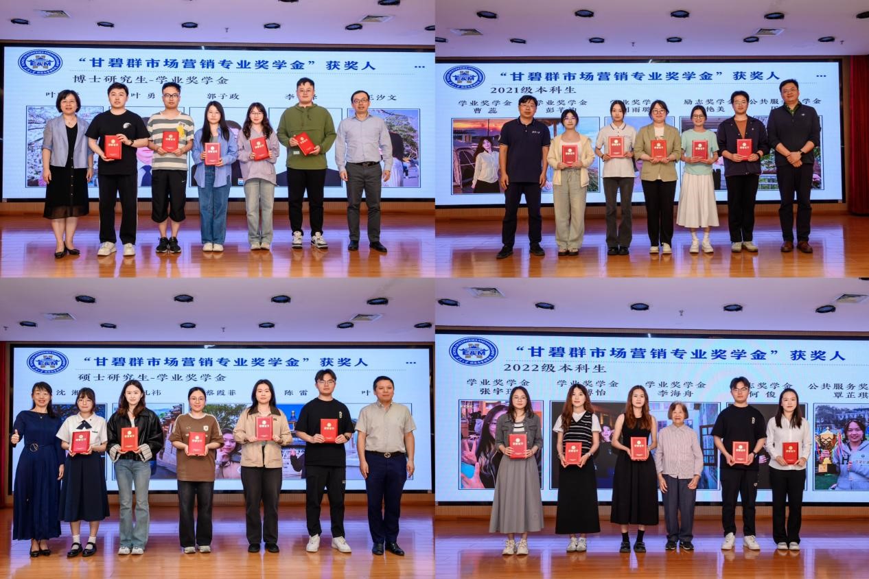 颁奖环节是整个典礼的高潮,学院领导分别为市场营销专业博士研究生、硕士研究生以及2021级和2022级本科生中的优秀学子颁奖。其中,甘碧群教授亲自为2022级获奖学生颁发奖项,这一温馨而庄重的时刻让在场的每一个人都感受到了甘教授对年轻一代的深切关怀。这不仅是对学生们的努力的认可,更是对学术传承精神的生动诠释,激励着学生们继续在学术道路上勇往直前。