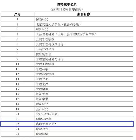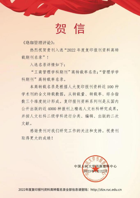 4月22日,中国人民大学主办、中国人民大学书报资料中心承办的“中国人民大学复印报刊资料转载名录发布论坛暨中国自主知识体系建构与学术期刊发展研讨会发布了“2022年度复印报刊资料高转载期刊、机构名录”和“复印报刊资料重要转载来源作者(2022版)。《珞珈管理评论》入选“2022年度复印报刊资料高转载期刊名录”。