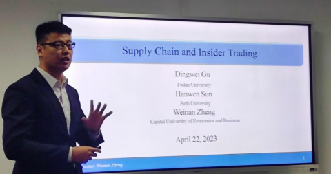 郑伟男老师的报告题为“Supply Chain and Insider Trading”,文章提供了一个模型来说明管理者可以利用其客户或供应商的不确定性,并通过增加其公司的产出来增加其内幕交易的盈利能力。研究发现管理者可以操纵真实的生产决策,通过内幕交易实现私人利益最大化,这种操纵还会影响供应链上的其他企业。此外,供应链上企业的联合价值是联合有效不确定性的倒u型函数,客户或供应商的不确定性越高的企业具有更高的内幕交易盈利能力和更高的企业价值。