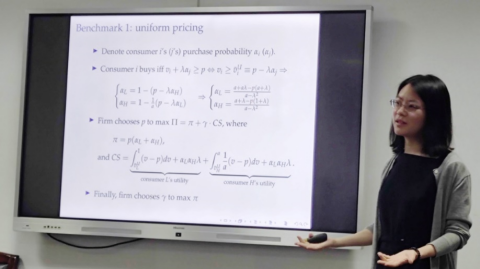 熊琰老师的报告题为“The Rise of Corporate Social Responsibility: When Firms Set Personalized Prices for Network Goods”,提出了一个基于产品的企业社会责任理论,将企业社会责任与企业的产品市场联系起来。企业的产品具有网络效应,即产品对每个消费者的价值随着消费者数量的增加而增加。此外,随着技术的发展,企业可以对每个消费者采取个性化定价。研究表明,企业可以将社会责任作为降低产品价格的手段,这种方式有助于实现股东价值最大化。