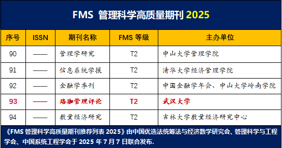 2025年7月7日,备受管理学界瞩目的《FMS管理科学高质量期刊推荐列表2025》盛大发布,《珞珈管理评论》以扎实的学术质量、鲜明的实践导向、特色的本土探索,首次跻身T2方阵,迎来创刊以来又一里程碑式突破。