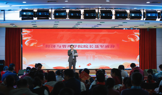 值此联欢同贺之际,院长聂军为本次联欢会致开场词。他提到,2025年学院聚力于育人为本,培养时代新人的本科教育深化转型,在共建开放融合、办学拓展的格局上屡创佳绩。“旧岁已展千重锦,新年再进百尺竿。”每一项成绩的背后,都浸润着全院教职工的智慧与汗水。展望未来,他号召大家以更加饱满的热情、更加昂扬的斗志,一起策马扬鞭,驰骋于数智化时代高等教育的广阔征程,共同谱写海棠书屋