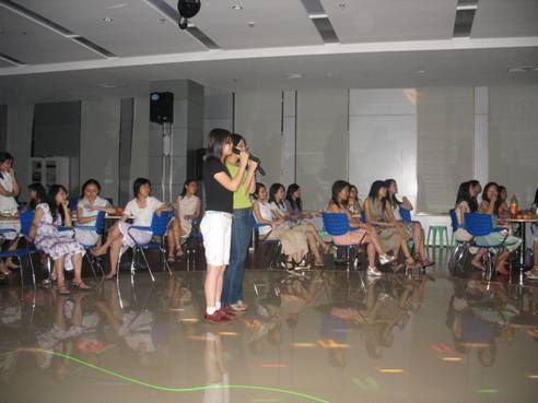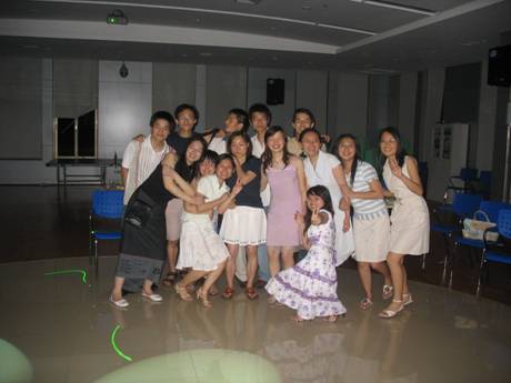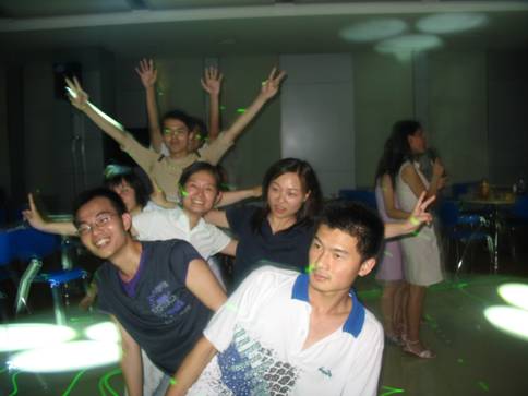 晚会从晚上六点半开始,一直持续到午夜.会计学和财务管理两个班的负责人事前已经为晚会准备了大量水果饮料,同学们不仅可以尽兴一展歌喉,还可以品尝美味的食物,现场也更增添了欢快的气氛.经过同学们的一番布置,会场变成了一个美丽的舞池,随着音乐声的响起和霓虹灯的闪烁,同学们不再矜持,纷纷抢着为同学和友情献唱:莫浩权同学的一曲《十年》声情并茂;邵菁同学遍撒《红豆》,祝福各位同学在未来岁月中生活幸福,事业有成……最后全体男生为女生献唱《对面女孩看过来》将晚会气氛推向了高潮。