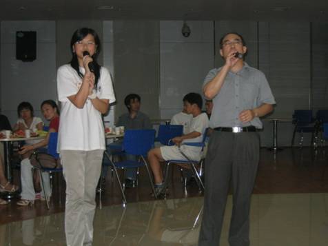 随后联谊晚会进入高潮,“教工之家”飘荡着激扬或伤感的音乐声中,老师和同学们共展歌喉,用歌声传递着对彼此的祝福。原来平时温容儒雅的老师们也拥有令人叫绝的唱功,旅游管理的张军老师带着自己的孩子唱的《同一首歌》,让大家陶醉在悠扬的旋律中;黄敏学老师一曲《送战友》赢得了满堂喝彩。霓虹灯的闪烁里,同学们充分展示着自己的青春激情,《大海》、《蒙娜丽莎的眼泪》等一首首经典的怀旧歌曲,淡淡的惆怅中,展示着毕业生们的多才多艺。现场气氛极其活跃。