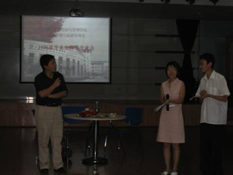 晚会在市场营销与旅游管理系副主任黄敏学教授热情洋溢的讲话中拉开了帷幕,黄教授对毕业生圆满完成大学四年的学业表示了祝贺,并讲述了和同学们愉快相处的经历。毕业生代表则用深情的语言阐述着对母校的依依不舍,大学四年的生活,“一幕幕的场景就像一张张绚烂的剪贴画,串连成一部即将谢幕的电影,播放着我们的快乐和忧伤,记录着我们的青春和过往”。