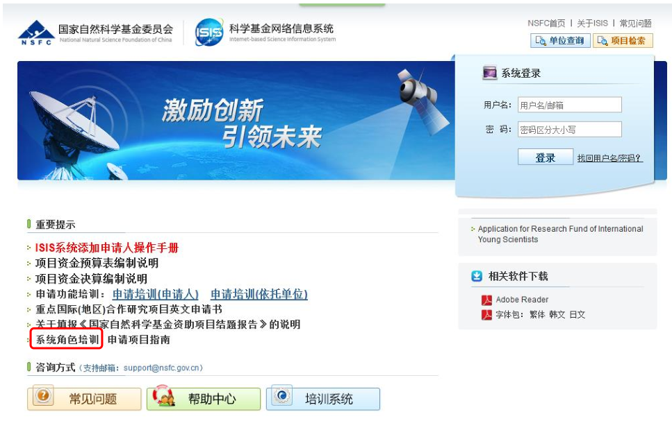 2. 对国家自科基金委申报系统不熟悉的申报人填写申报书前可点击系统登录页面左下角的“系统角色培训”菜单来了解操作流程(附件图示)。