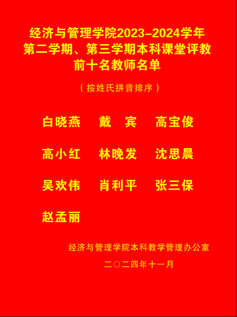 海棠书屋 2023—2024学年第二学期、第三学期本科课堂评教前十名教师名单
