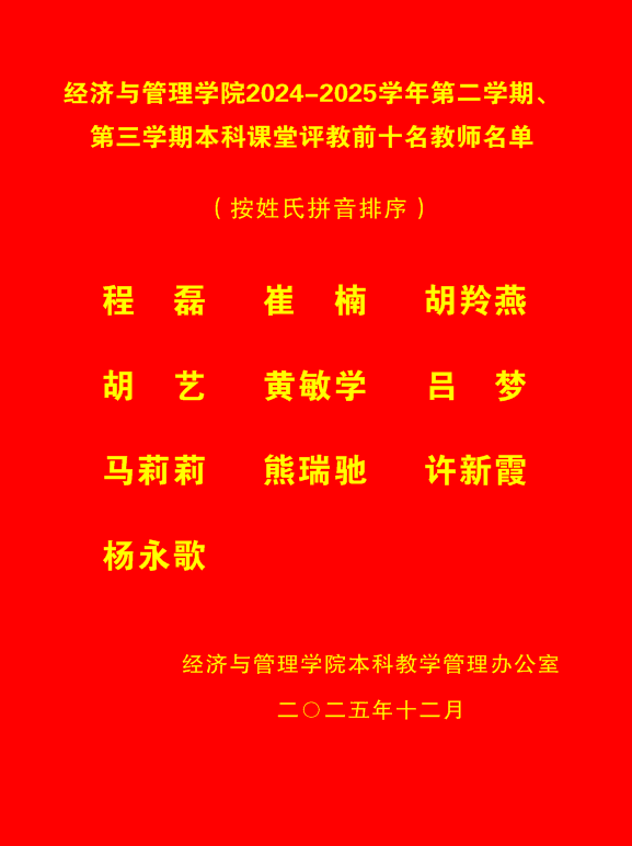 海棠书屋 2024-2025学年第二学期、第三学期本科课堂评教前十名教师名单