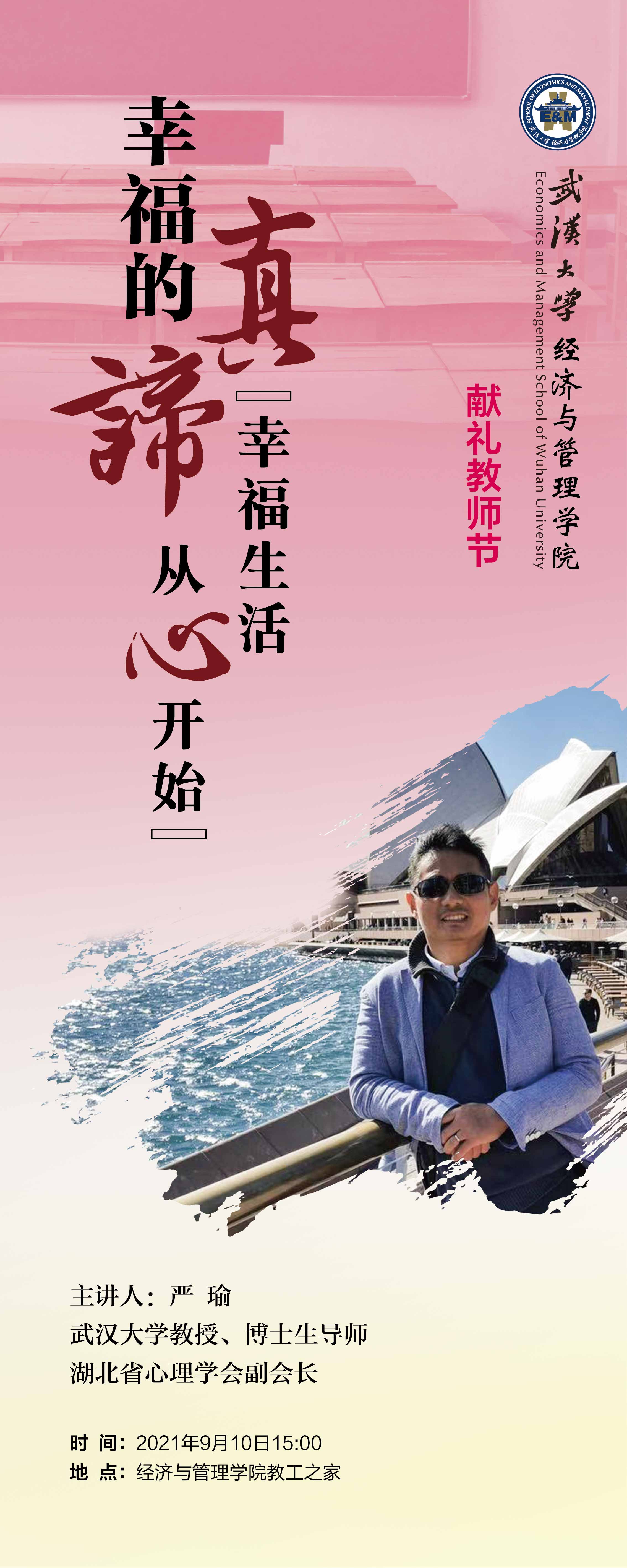 教授严瑜老师带来“幸福的真谛:幸福生活,从‘心’开始”的主题分享。值此教师节之际,学院奉上严瑜老师充满温度和爱意关怀的讲座解读心灵与幸福,作为教师节的一份特殊献礼,献给每一位老师。