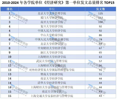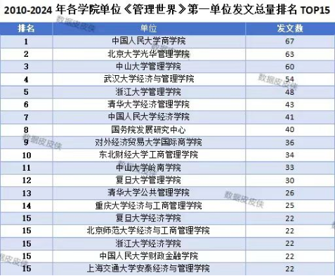 附:数据皮皮侠2010-2024各学院单位《经济研究》《管理世界》第一单位发表总数排名