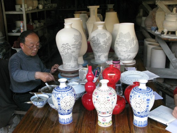 座谈会结束的时候,天色已暗,但第一天的行程并没有结束,同学们在李局长的带领下来到景德镇陶瓷博物馆,实地观看了制陶制瓷的工艺和典型的景德镇瓷器。景德镇悠久的制陶制瓷历史,精益求精行云流水的工艺流程,胸有成竹七十年如一日的老艺术家,有着数百年甚至上千年的古窑,堆放成小屋子形状的柴火,典型的徽派风格建筑和保留完好的明清古建筑群……这些都给师生们留下了很深的印象。
