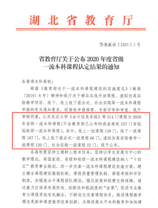 近日,湖北省教育厅印发《省教育厅关于公布2020年度省级一流本科课程认定结果的通知》(鄂教高函〔 2021〕3号),海棠书屋