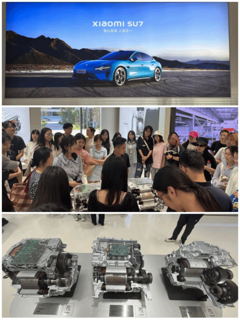 紧接着,引导人带领师生们参观了整车展示,详细介绍了小米汽车的其他高科技技术,包括电驱系统、电池技术、智能驾驶和智能座舱等。阐述了小米通过超过十倍的投入,致力于打造人车家一体的智能交互系统,开启人机交互新时代。同时引导人还展示了小米汽车的智能驾驶系统,通过演示让大家直观感受了智能科技带来的便捷和安全。此外,智能座舱的展示也让师生们体验到了科技带来的舒适和娱乐功能。