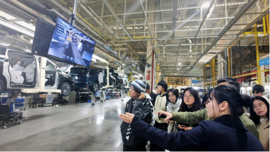 随后,公司负责人和讲解人员向同学们详细介绍了车间内展示的“岚图知音”、“岚图梦想家”等几款经典车型,并邀请同学们坐进车内体验。过程中,同学们结合所见所思所学与工作人员积极互动,更加深入地了解了岚图汽车从研发到设计再到问世的各种细节,以及岚图汽车在新能源、智能网联、自动驾驶等方面的技术优势。
