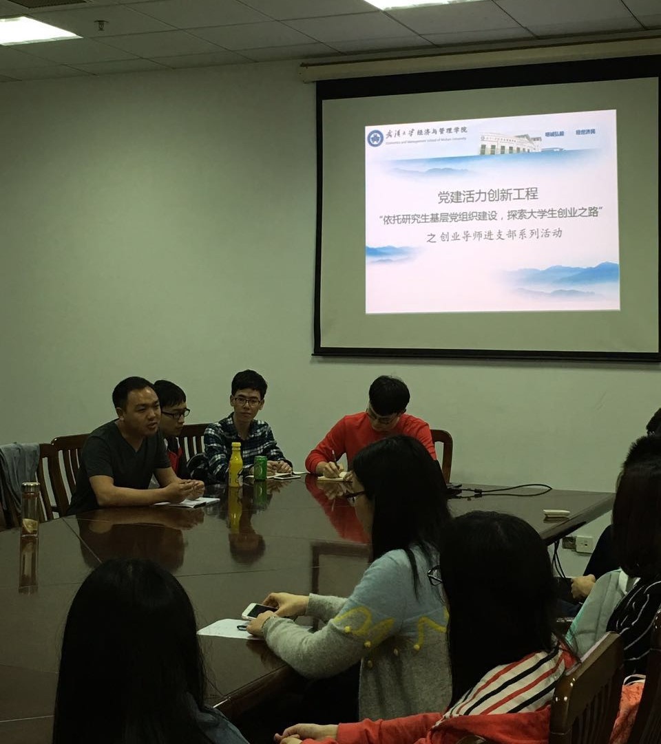 伴随着学院党建创新工程“依托研究生基层党组织建设,探索大学生创业之路”有条不紊的稳步开展,受到了同学们的一直好评,目前该系列活动已进入第四阶段——创业导师进支部。2016年4月26日中午12点半,2015级科硕一支部和科硕四支部的党员在学院第四会议室围绕“学习校园创业典型,营造支部创新氛围”举行了创业导师进支部主题党日活动,邀请到学返网创立者之一,来自水利水电学院博士二年级的李皓鑫学长做客海棠书屋
