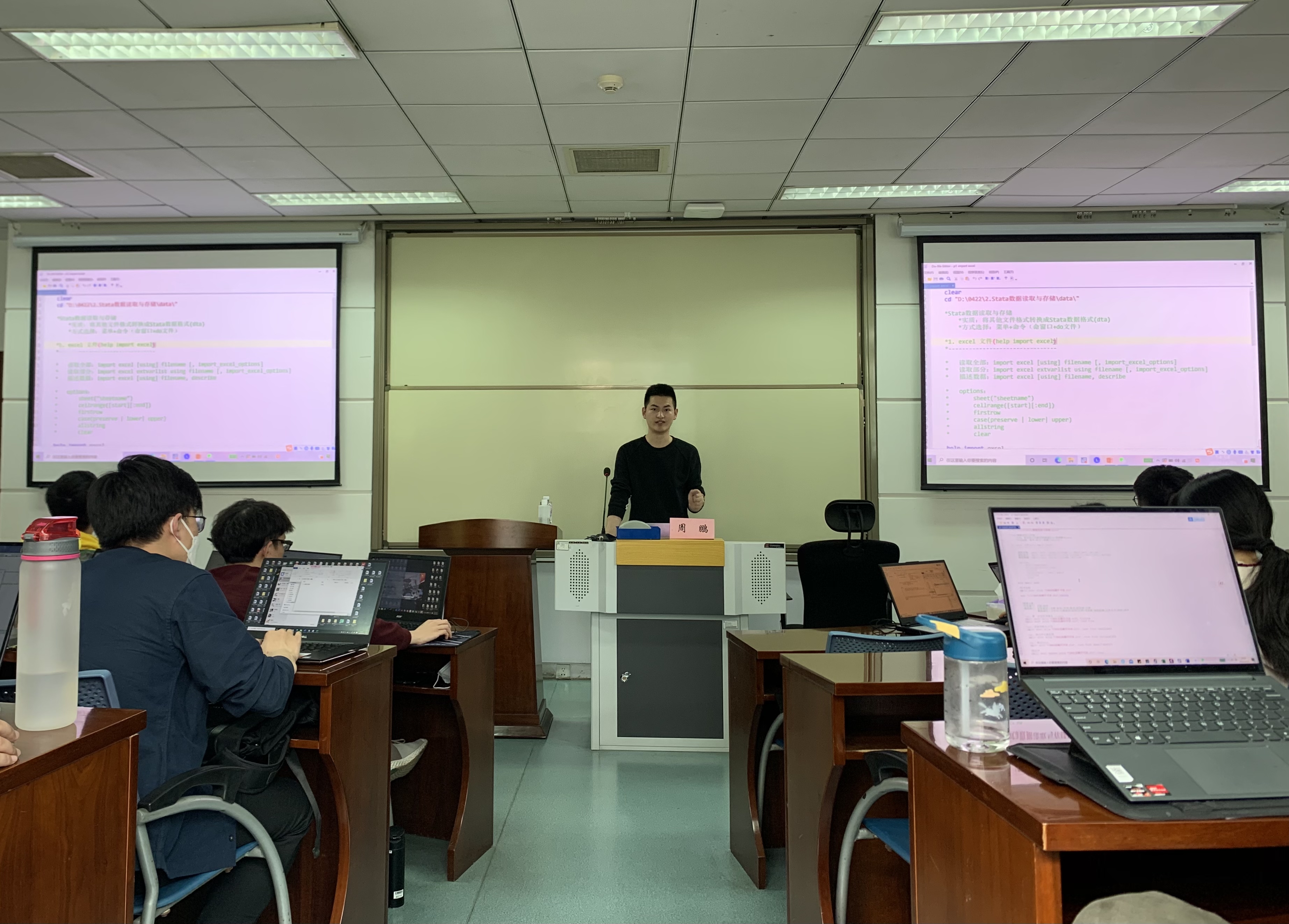 2018级金融学博士生周鹏学长受邀为大家讲解Stata数据处理。活动现场座无虚席,气氛热烈。