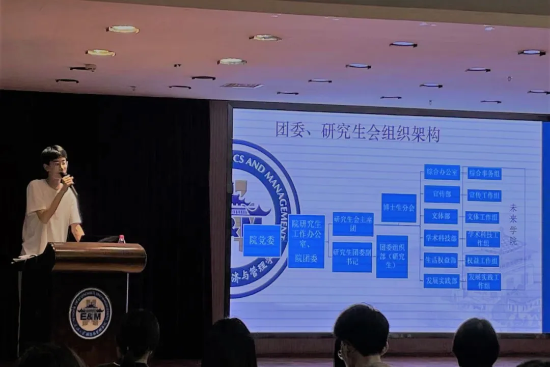 随后由邓龙真同学对研究生会的整体工作情况进行了介绍,展示了研究生会、未来学院的组织架构及各部门的职能,帮助新成员对研究生会的职能定位、组织构成形成整体认识。