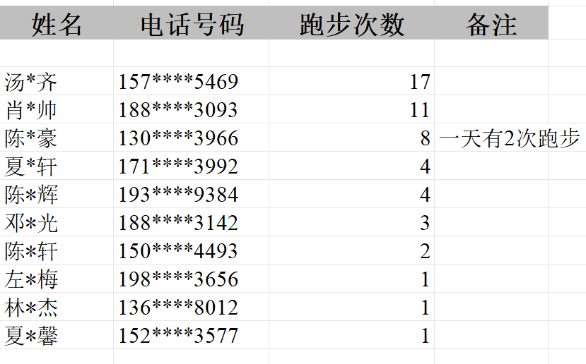 社群成员积极响应,10位同学上传了大量跑步打卡截图。其中,第一名以17次打卡的成绩遥遥领先,展现了非凡的毅力和运动热情。紧随其后,两位同学分别以11次和8次打卡获得二三名,同样值得称赞。还有众多打卡1-4次的同学,值得鼓励。