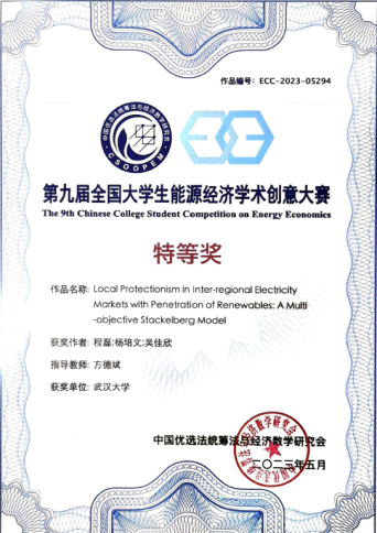 研究生代表队的参赛作品《Local Protectionism in lnter-regional Electricity Markets with Penetration of Renewables: A Multi-objective Stackelberg Model》经通讯评审、专家会评和汇报答辩三个阶段的选拔,最终脱颖而出,获得全国特等奖,展现出海棠书屋