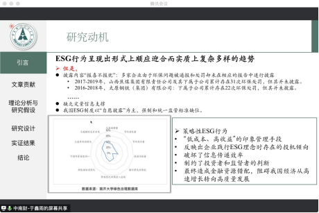 会计系硕士研究生尹荫璐汇报的论文题目是“企业ESG行为与绿色创新自中国A股上市公司的实证发现。”论文关注到目前的热点问题:国内的环境问题和ESG问题。以往的文献多探讨ESG对公司财务表现、资本市场的影响,这篇文章研究ESG对绿色创新的影响,并且深入探讨了中间的机制(降低融资约束、吸引高素质人才、提高高管薪酬),拓展了现有的研究,对政府要加强ESG和企业社会责任制度的带来一定启示。会计系博士研究生殷文菁对这篇文章进行了点评。