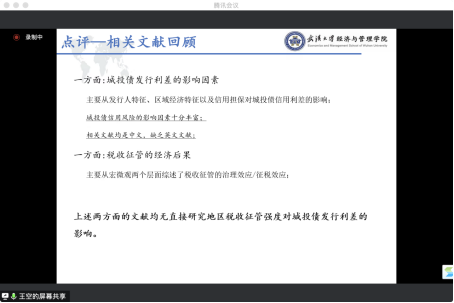 会计系硕士研究生向珊报告的论文主题是“税收征管强度与城投债发行定价”。论文从地区间税收征管强度的角度出发,实证考察了税收征管强度对城投债发行定价的影响。研究得出了地区税收征管强度能够降低城投债的发行成本的结论,且这一作用是由于地方政府担保能力提高和信息不对称程度降低带来的。进一步研究发现在债券无担保、地区金融发展水平较弱、城投公司偿债能力较差、地区欠发达时,税收征管的效果显著。研究结论提供了税收征管和城投债发行定价关系的经验证据,为地区间的税收征管、防范地方政府债务风险、降低城投公司发债成本提供了借鉴。会计系博士研究生王空对这篇文章进行了点评。