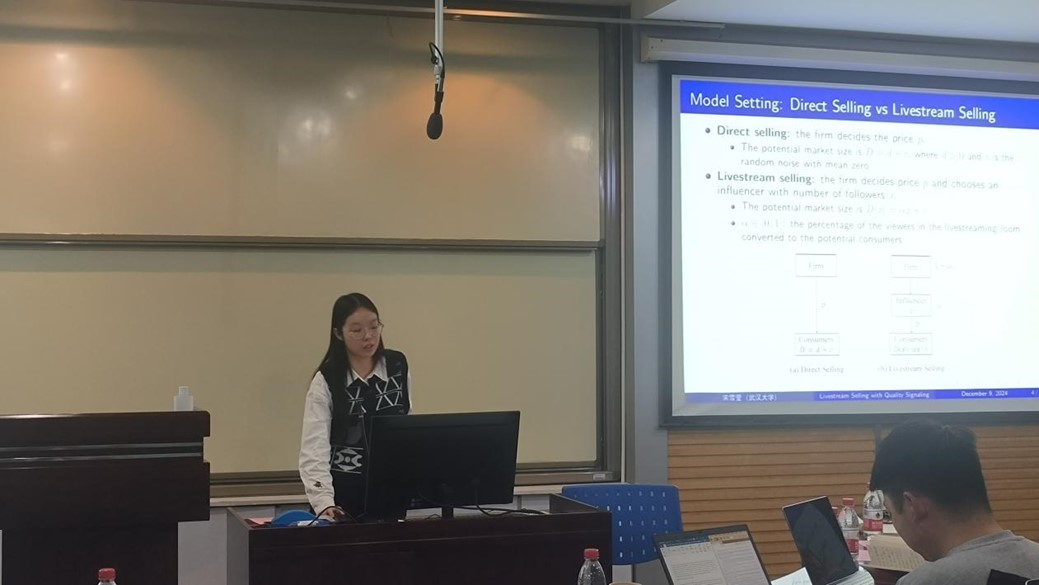 宋雪莹硕士生以“Livestream Selling with Quality Signaling”为题介绍了网红直播带货下的商家如何通过选择其合作的网红以及设定产品的售价向消费者传递关于产品质量的信号,发现商家应该通过设定一个偏离完全信息最优水平的高售价或选择与粉丝量超过完全信息最优水平的网红来传递高质量的信号。