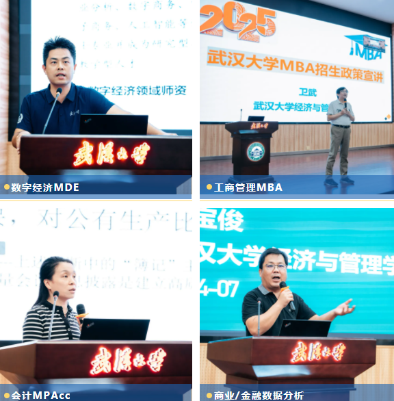 项目宣讲环节,刘成从数字经济专业的开设背景、师资力量与培养方案等方面介绍了学院2025年新增招生的数字经济(MDE)专硕项目情况;卫武从学校、学院的学科建设与校友发展,MBA项目培养特色与报考信息等方面介绍了工商管理(MBA)专硕项目情况;刘颖斐从专业定位、武大MPAcc的发展沿革与培养特色与成效方面介绍了会计(MPAcc)专硕项目情况;高宝俊从商业数据分析项目的社会需求、自主开发的课程体系、极高的师生满意度数据等方面介绍了工程管理(MEM,商业/金融数据分析方向)专硕项目情况。