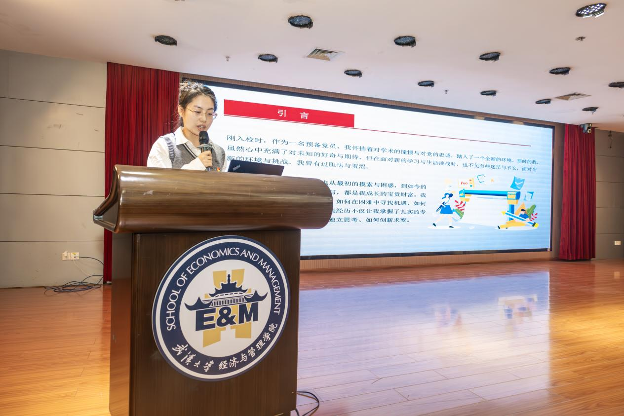 理论硕二党支部刘一苇同学为大家朗诵了文字作品《共鉴荣光,笃行致远——学习贯彻习近平总书记重要回信精神》。在刘一苇同学的深情朗诵中,各位同志深切感受到习近平总书记对武大学子的殷殷期望。