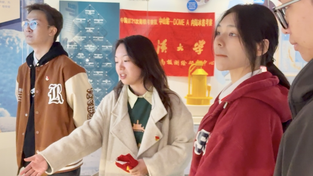 南北极科学考察主题展,切身体会极地科考故事。唐恬同学带领大家缓缓走过每一个展区,为大家详细讲解每一项展品背后的故事。这份代代相传的不畏艰险、勇于探索的科研精神激励着在场每一位同学。