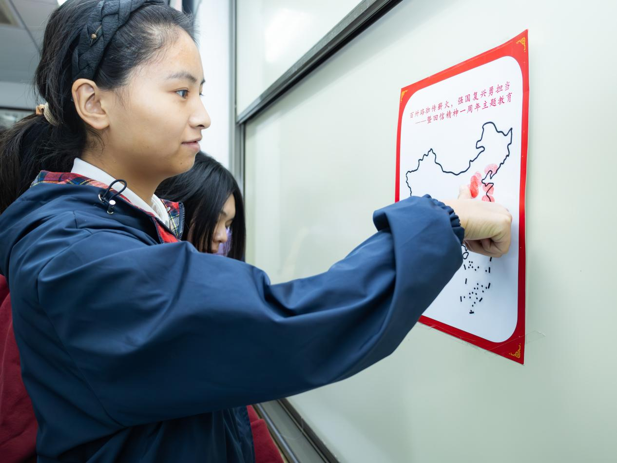 在激扬的《有我》音乐声中,与会师生在中国地图上按下手印,许下了强国有我、复兴有我、未来有我的青春誓言。每一个手印都承载着师生们的庄严承诺:无论身处何地,都将牢记初心使命,立志为祖国的发展贡献力量,让青春之花绽放在祖国需要的地方。这些鲜红的手印,如同一团团炽烈的火焰,不仅映照着师生们的青春梦想和热血激情,更寄托着他们对未来的无限憧憬和坚定的承诺。