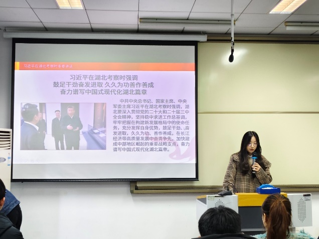 应用经济学硕士第二党支部书记吴林轩领学了习近平总书记在湖北考察时的重要讲话精神。吴林轩介绍,习近平总书记此次在湖北考察强调了文化保护、乡村振兴、科技创新的重要性,并提出了推进科技创新等六个方面的要求,为湖北进一步发展提供了指引。