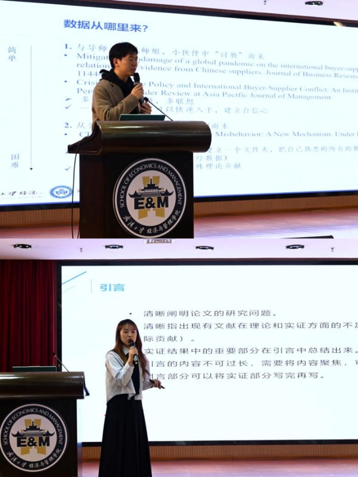 2022级市场营销专业博士生邓潇扬和2021级企业管理专业博士生王茂琼同学分别以“学术声音如何讲‘好’中国故事——软件运用与实证策略选取”和“学术声音如何讲‘出’中国故事——学术论文谋篇布局”为主题进行分享,为同学们讲述有关论文写作、数据收集以及选题投稿等方面的科研经验,助力同学们提升学术研究的精准度与深度。