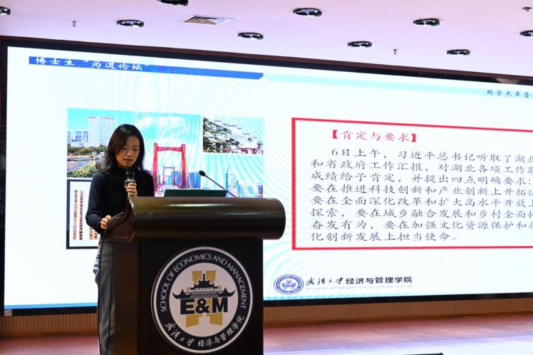 理论经济学博士党支部书记楼紫晨带领同学们学习了《习近平总书记在全国教育大会上的重要讲话精神》和《习近平总书记在湖北考察时的重要讲话精神》。在这一环节中,同学们深刻领会了习近平总书记关于教育和青年发展的重要讲话精神,这为将来的学术科研和道德规范提供了思想指导。