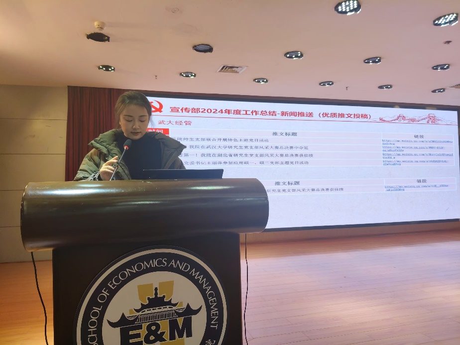 研究生党总支委员肖思清总结汇报了宣传的工作成果。宣传部在2024年共推出推文新闻推送70余篇,并将优质稿件投稿至“珞珈红”等校级平台,同时完成全年党费收缴及活动报销工作。肖思清认为2024年宣传部的工作亮点是宣传载体的多样化,宣传平台的多维化,以及宣传视角的多元化。针对目前存在的问题,下一步的工作重点是加强理论学习与研究,请专业人士进行技能培训,同时建立健全激励机制和评价体系。