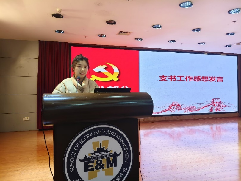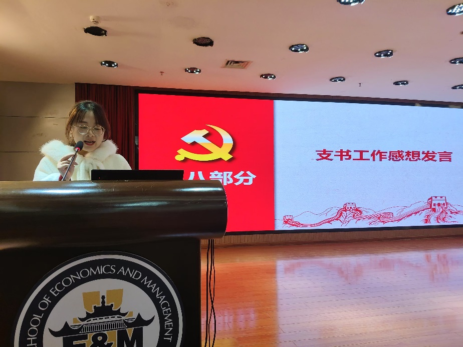 在听取各部门工作汇报与唐恬的经验分享后,现场支部书记就工作感想发表了自己的看法。工商硕二支书左腊梅支书表示,在思想上,要更加关注国际国内形势和世界发展大势。在学习和实践上,要将优秀的经验应用到自己的工作中。在能力上,要在实践中积累更多经验。展望未来,将在老师和党总支的指导下配合工作,不断前行。