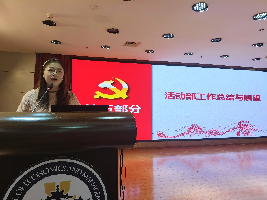 研究生党总支委员韩睿怡针对组织部的工作进行汇报。2024全年新增44人申请入党,54人被列为入党就分子,87人发展成为预备党员,79名预备党员通过考察转正为正式党员。组织部除了日常工作外,还重点强调了两项工作。一是坚持把政治标准作为发展党员的首要标准,二是对支部发展对象推优程序进行了优化。在2025年将进行第一批预备党员转正,并开展毕业生建档和查档工作。